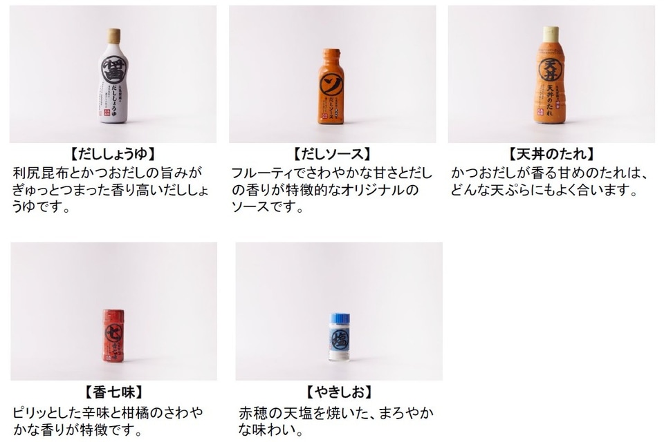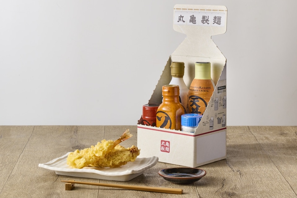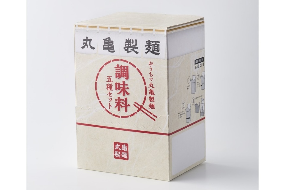 「釜玉うどん」や「おろし醤油うどん」のお供でおなじみの「だししょうゆ」、うどんには欠かせない「香七味」、天ぷらと相性抜群の「だしソース」、丸亀製麺オリジナルの甘めの「天丼たれ」、どんな料理にも合う「やきしお」の5種をひと箱に詰めた。卓上にそのまま置ける特製ボックス付きとなっている。