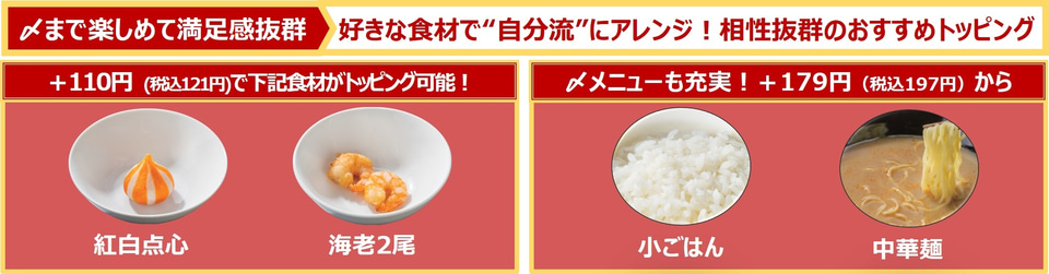 また、トッピングとして「紅白点心」「海老」、シメメニューとして「中華麺」「小ごはん」を用意しており、好みで追加できる。