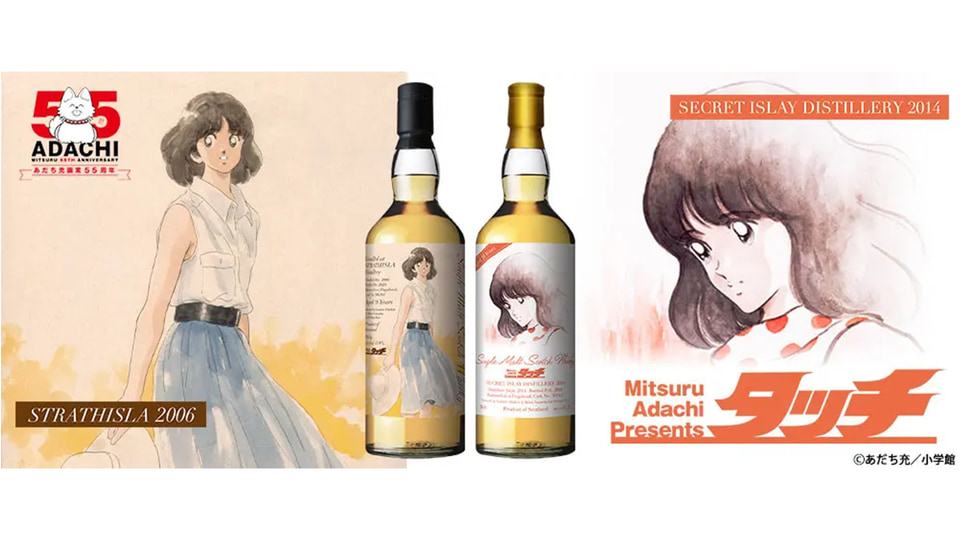 「タッチ」の原作者である、あだち充先生画業55周年を記念したもので、ラベルには人気ヒロインの浅倉南が登場。「週刊少年サンデー」で連載されていた同作品は、コミック累計部数が1億部を超える大ヒット作品として名高い。2本のシングルモルト・ウイスキーは、ウイスキー評論家の山岡秀雄氏が厳選したもの。