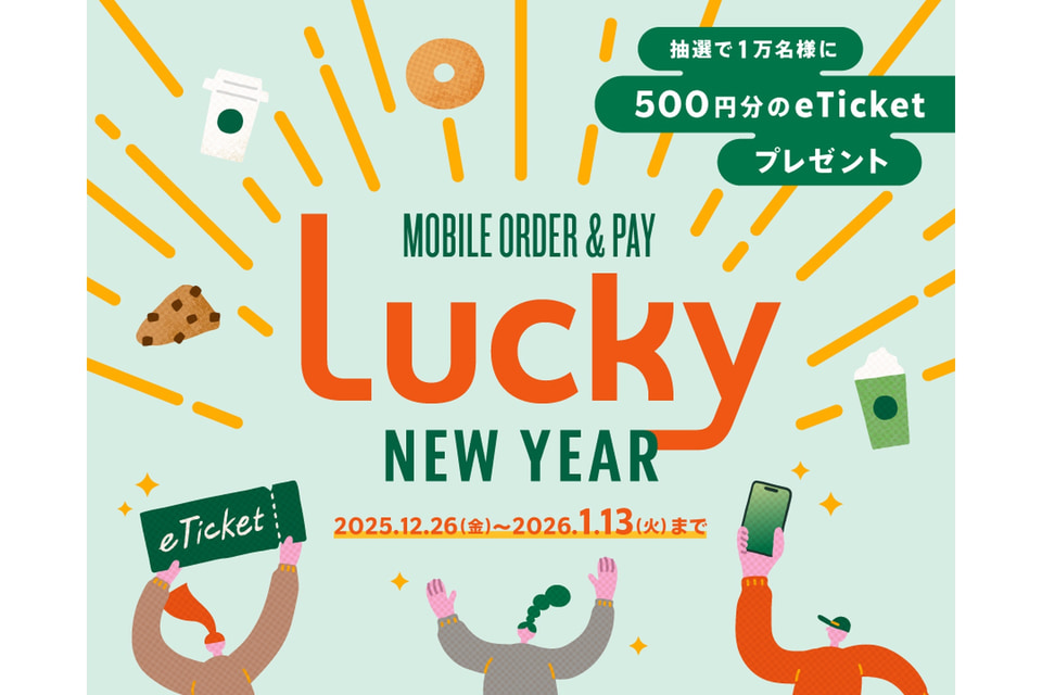 「玉露抹茶 フラペチーノ」「玉露抹茶 ラテ」の発売に合わせて、「Mobile Order & Pay」のLucky New Yearキャンペーンを実施する。期間中にエントリーのうえ、「Mobile Order & Pay」の利用者から、抽選で1万名に500円分のeTicketをプレゼントする。