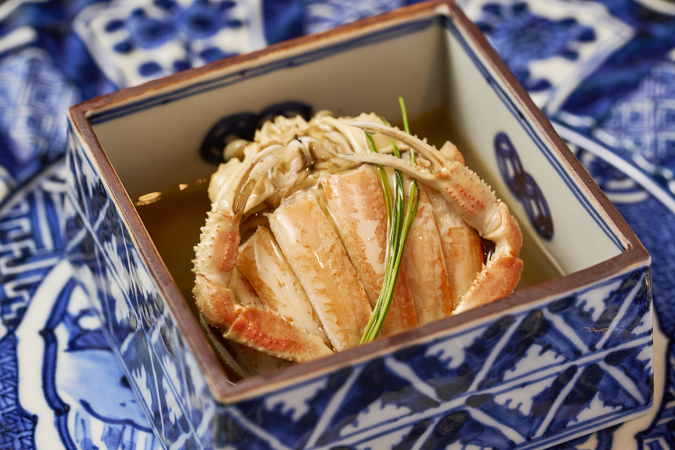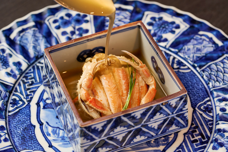 石川県では蟹をおでんの具材「蟹面」として味わう食文化がある。蟹面は、ズワイガニの甲羅にカニの身や内子(うちこ)、外子(そとこ)を詰めて盛り付けた冬限定の逸品。界 加賀では、この蟹面の仕上げに、とろりとした出汁の餡をかけて提供する。蟹の旨味と、濃厚な内子やプチプチとした外子の食感が楽しめる。