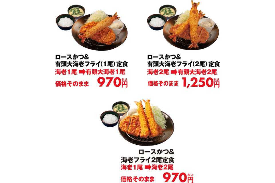 「ロースかつ&海老フライ定食」の価格はそのままに、「有頭大海老フライ」にグレードアップできる。有頭大海老フライ2尾なら通常価格より400円お得になる。また、「ロースかつ&海老フライ定食(海老1尾)」は価格そのままで、海老フライをプラス1尾、合計2尾に増量する。通常価格より280円お得になる。