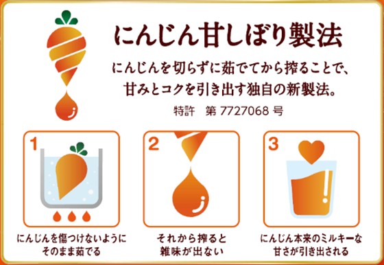 北海道や茨城県などを産地とする旬のにんじんを使用したにんじんジュース。にんじんを切らずに茹でてから搾る独自の新製法「にんじん甘しぼり製法」によって甘みとコクを最大限に引き出しており、雑味の少ない味わいとにんじん本来のミルキーな甘さを楽しむことができる。