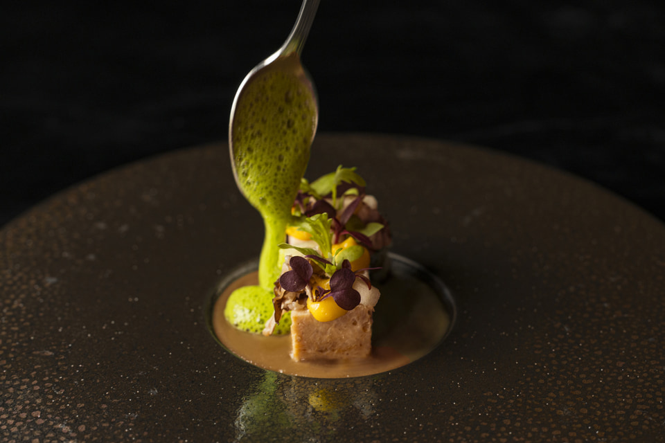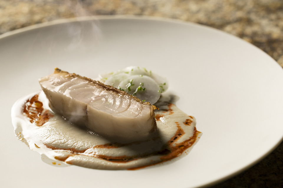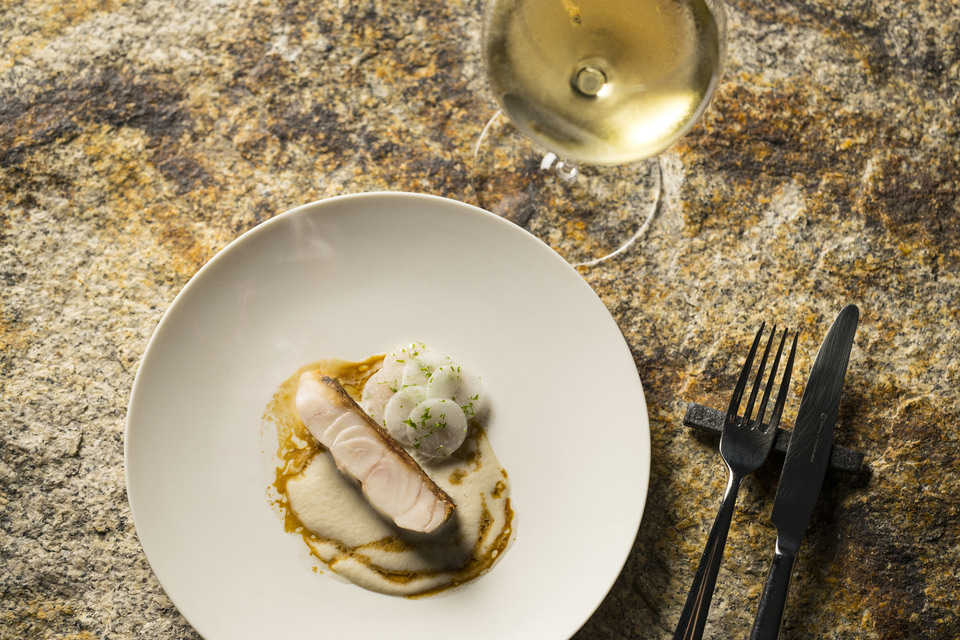 スケトウダラの白子を使用したかまぼこ「たちかま」から着想を得た魚料理も楽しめる。たちかまは、旨味を凝縮させたソースへと仕立て、旬の焼き魚と合わせた。白子の風味豊かな濃厚ソースは、淡白な旬の白身魚と付け合わせの焼きリゾットのどちらとも相性が抜群。