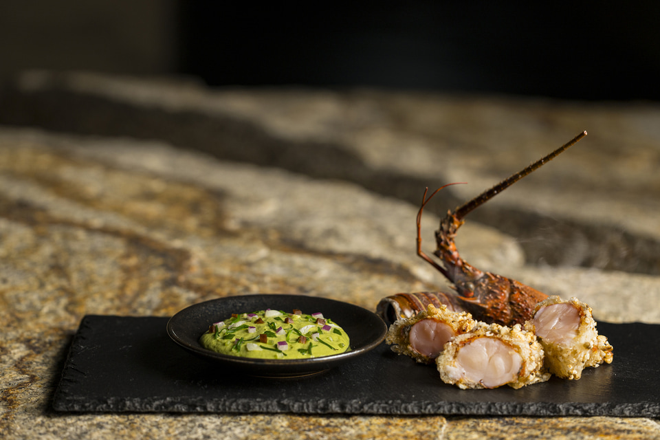 徳島県の郷土料理「ならえ」は、元々は奈良漬が入っていたこと、そして7つの食材(大根、にんじん、油揚げ、ごま、れんこん、干ししいたけ、こんにゃく)を和えていることが名前の由来とされている。その“ならえ”にクリーミーに仕上げた豆漬けのタルタルに、奈良漬やゆり根などの野菜を加え、香ばしく揚げた伊勢海老と合わせた。