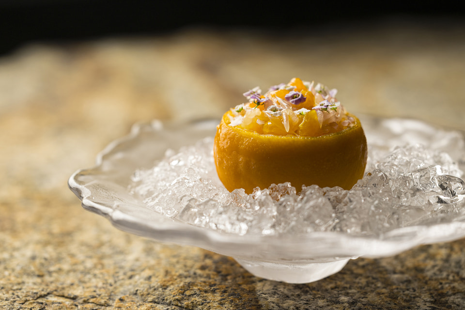 徳島県の郷土料理「ならえ」から着想を得た一品や、北海道の「たちかま」をアレンジした魚料理など、フランス料理の技法とシェフの独創的な感性と技術を融合させた冬限定メニューが楽しめる。