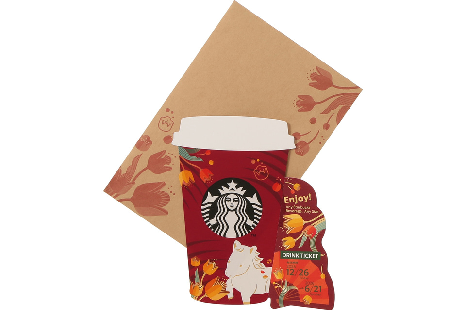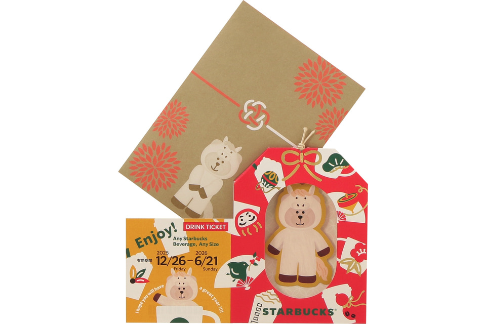同時発売のマグカップやキャニスターと同じデザインシリーズの、ドリンク引換券付きメッセージカード。ドリンク引き換え有効期間は2025年12月26日~2026年6月21日で、店内飲食700円、持ち帰り687円税率8%までのドリンクと交換できる。