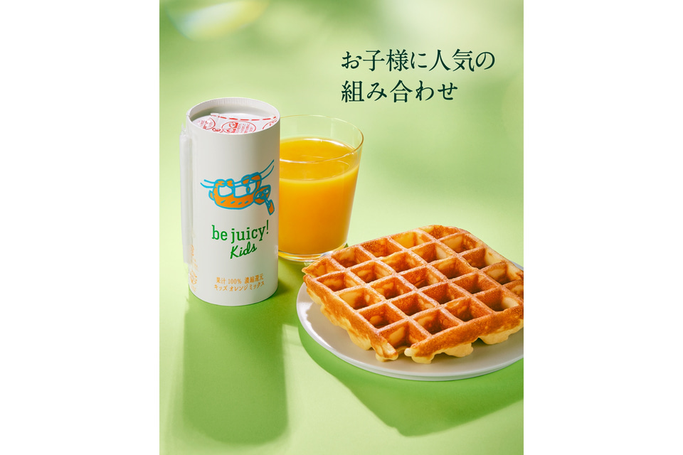 家族で楽しめるペアメニュー be juicy!kids(オレンジミックス)とアメリカンワッフル