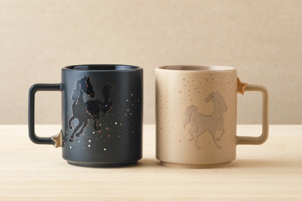 2026年の干支である「午」のモチーフを、スターバックスリザーブのロゴの象徴である星とともに星座に見立ててデザインした新年限定マグカップ。古くから「幸運のお守り」として親しまれている馬蹄のモチーフで、2つのマグを並べると馬が向かい合うデザインとなっている。