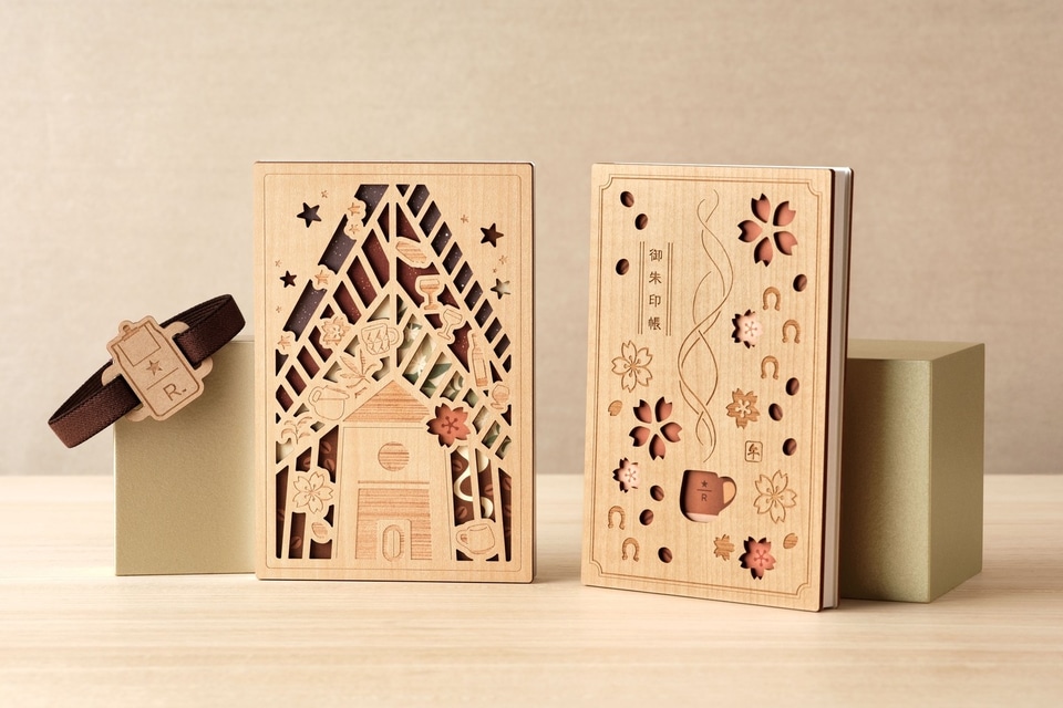 御朱印帳が新デザインで2種登場する。ロースタリー 東京を象徴する桜と2026年の干支である午をイメージした、新年の始まりを表現したデザインと、ロースタリー 東京の外観をイメージした枠組みの中に、各フロアを象徴するモチーフを配した、華やかで存在感のあるデザイン。
