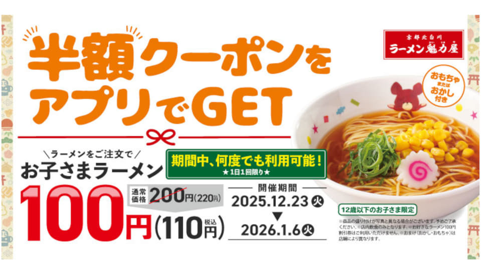 京都北白川ラーメン魁力屋(魁力屋)は「アプリ限定お子さまラーメン半額キャンペーン」を開始した。期間は12月23日~2026年1月6日。
