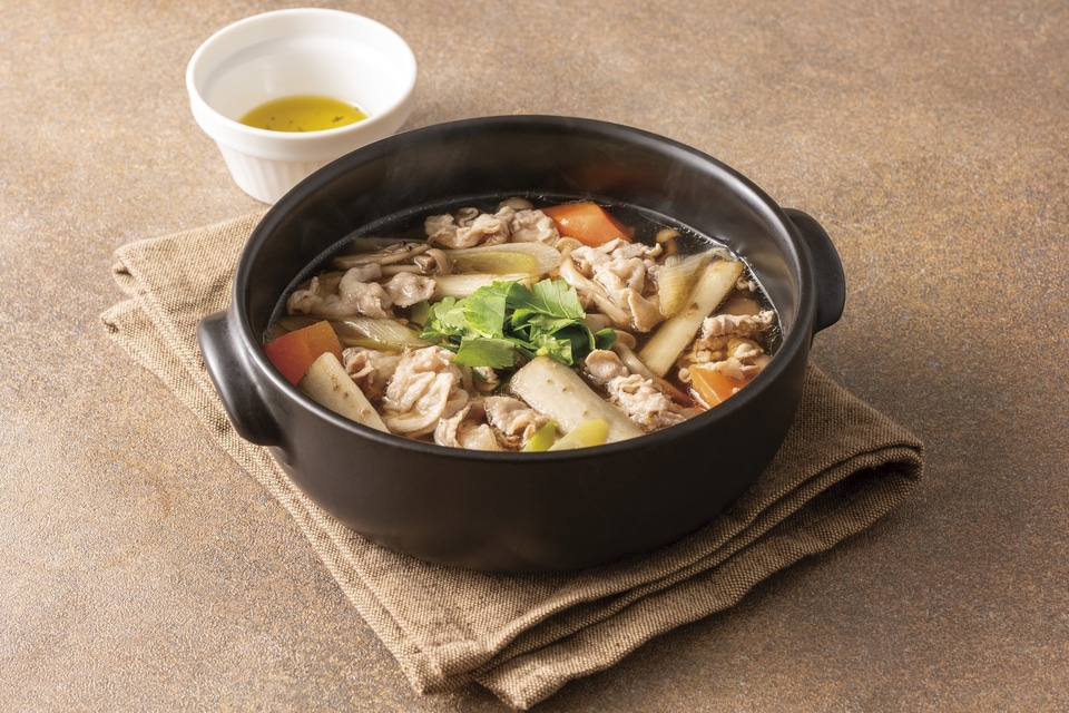山形豚の良質な脂や、ごぼう、長ねぎ、しめじなどの旨みがしっかり染み出した出汁鍋。オリーブオイル、ブラックペッパーとの相性もよい。