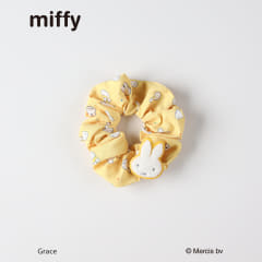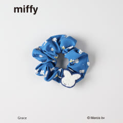 さまざまな年代のミッフィーのプリントやもこもこサガラ刺繍のミッフィーの顔が施された、髪や手首、バッグなどにつけられるカラフルなシュシュ。