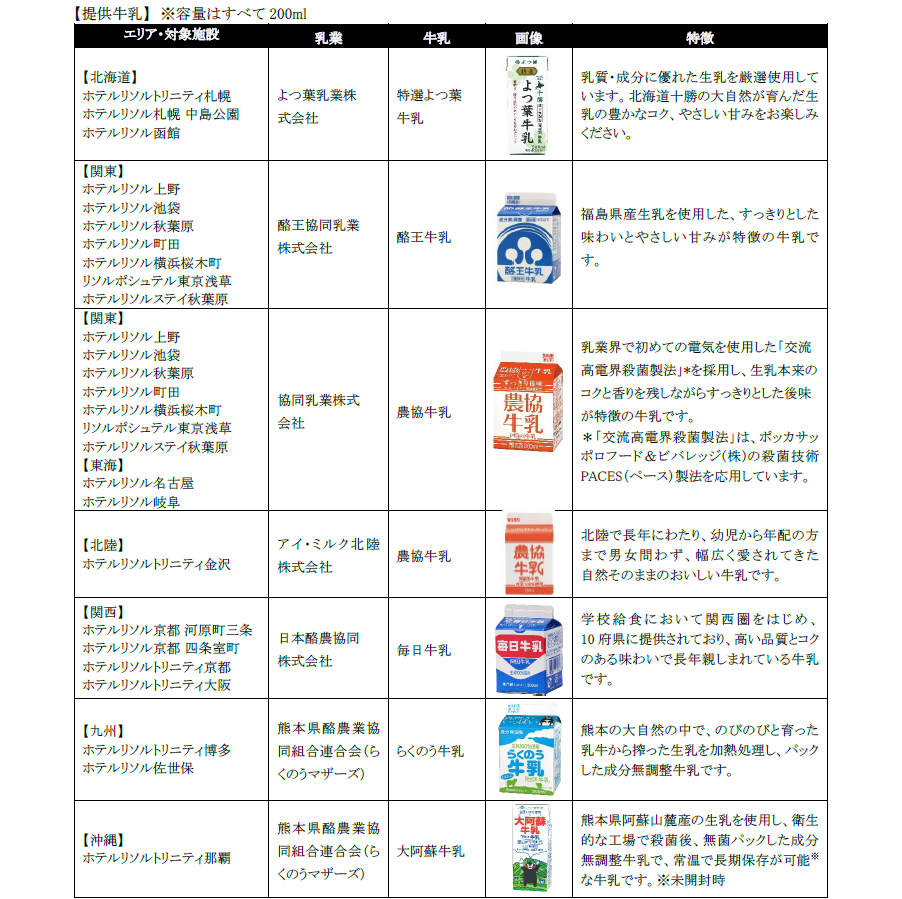 同企画は全国のリソルホテルズの20施設にて行なわれるもので、ホテルロビーに専用の冷蔵庫を設置し、宿泊客が自由に手に取れる形で提供する。ホテルによって異なる「ご当地牛乳」は全国各地から選定したもので、200mLのミニパックで提供する。