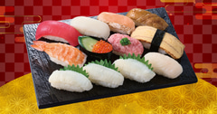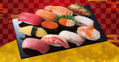 本まぐろ中とろ、本ずわいがに爪下、ぶり、数の子などの豪華ネタと人気ネタを盛り込んだ40貫の「デラックス盛」が4741円、豪華ネタを詰めた「贅沢ごちそう盛」が1598円、本まぐろ中とろ入りの「贅沢まぐろ盛」を1296円で販売するなど、全7商品を用意する。