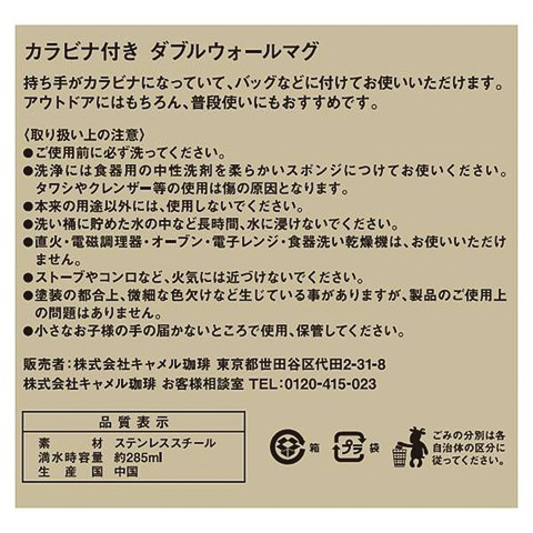 ステンレス製のダブルウォールマグで、持ち手がカラビナになっているためアウトドアにも持ち出しやすい。満水時の容量は約285mL。