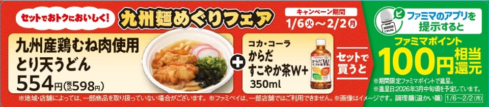 また、期間中にファミマのアプリ「ファミペイ」を提示して、「九州麺めぐりフェア」対象の調理麺とコカ・コーラ「からだすこやか茶W+350ml」をセットで購入すると、ファミマポイント100円相当を還元するキャンペーンも1月6日~2月2日の期間実施する。