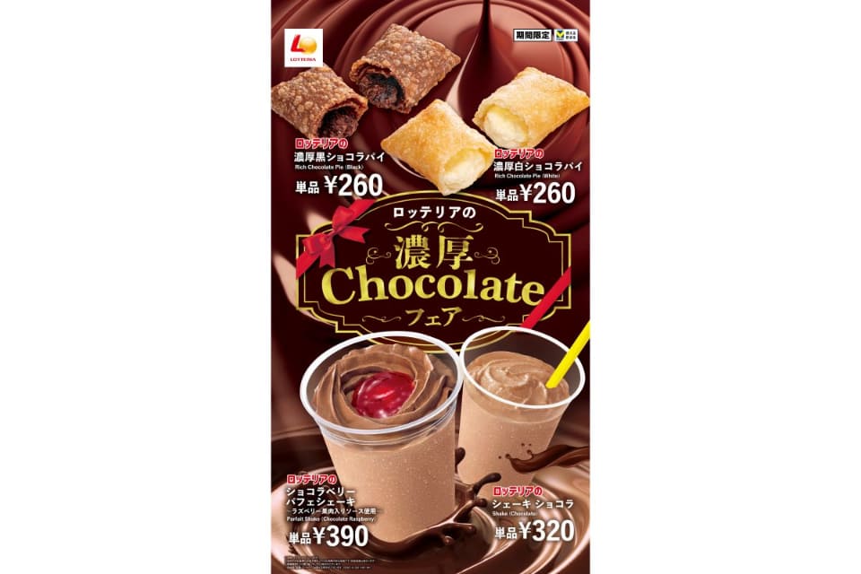 ロッテリアは「濃厚Chocolateフェア」として、「濃厚黒ショコラパイ」「濃厚白ショコラパイ」「ショコラベリーパフェシェーキ」「シェーキ ショコラ」のチョコづくしのスイーツ4品を期間限定で1月14日に発売する。