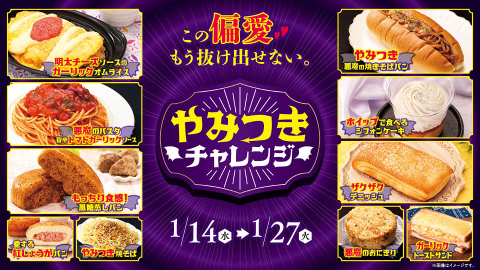ガーリックやマヨネーズ、めんつゆ(悪魔系)といった背徳感と満足感を兼ね備えた味付けや、「もっちり」「ザクザク」とした食感など、「やみつき」にこだわった本企画。ブランド20周年記念復刻商品「悪魔のおにぎり」を筆頭に、「悪魔のパスタ 旨辛トマトガーリックソース」「やみつき悪魔の焼きそばパン」など10品を展開する。
