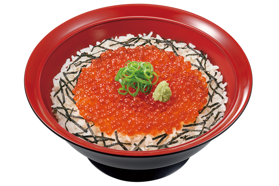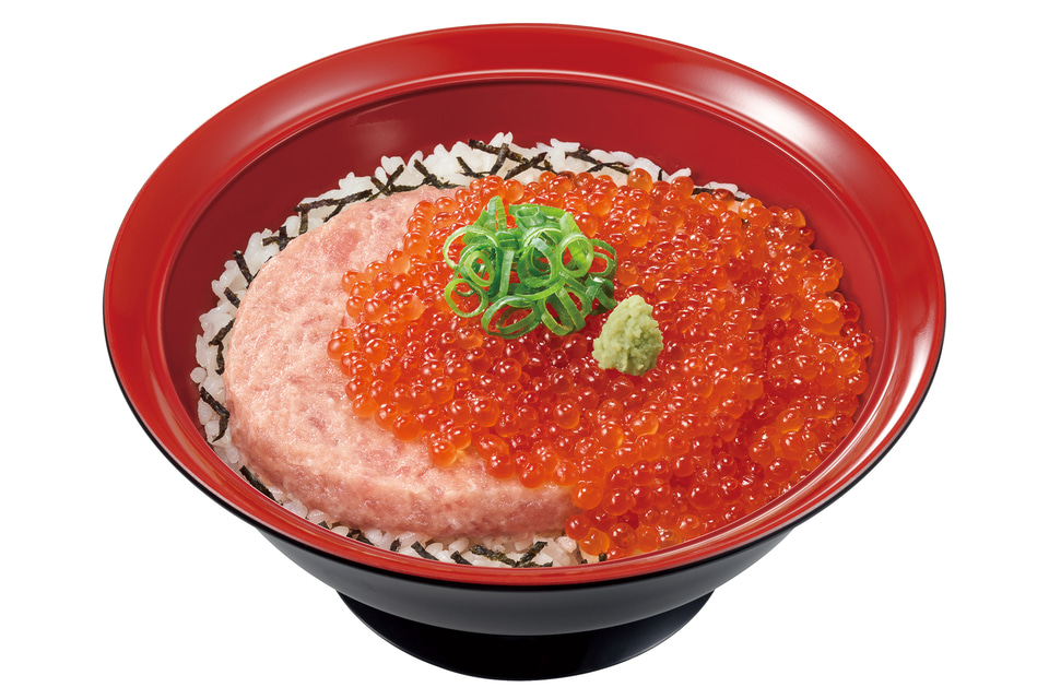 すき家の人気商品「まぐろたたき丼」に、天然のいくらを加えた贅沢丼で、並盛、ごはん大盛、そして大盛のごはんに並盛の倍量のいくらとまぐろたたきをのせた特盛を用意している。
