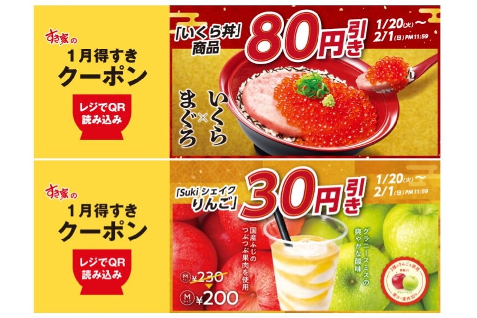 すき家、いくら丼80円引き/Sukiシェイク りんご30円引き「1月得すきクーポン」第2弾配信