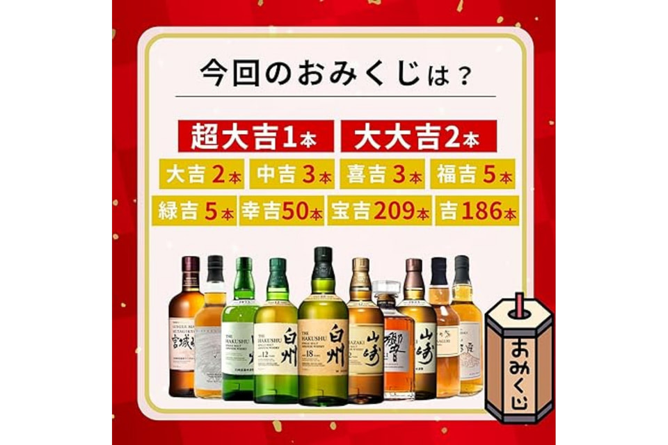 1口4880円、466口限定の抽選販売で、1等の超大吉は「白州18年」、2等の大大吉は「山崎12年」、3等の大吉は「白州12年」と、希少なジャパニーズウイスキーがラインアップされている。