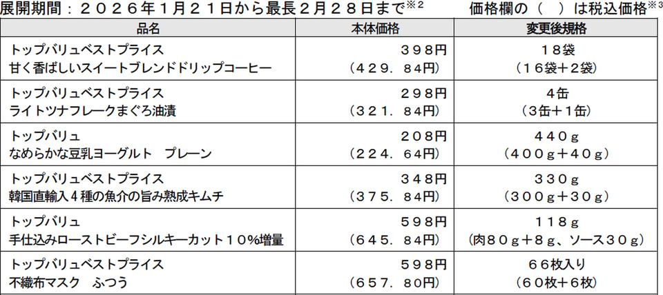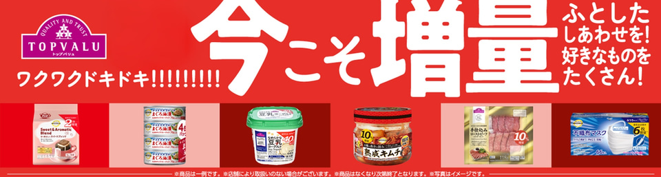 日常の食卓や家事に欠かせない商品を中心に、期間および数量限定で増量を行なう(商品によって展開時期、および店舗によって販売価格が異なる)。トップバリュの「甘く香ばしいスイートブレンドドリップコーヒー」は2袋増量の18袋429.84円、「ライトツナフレークまぐろ油漬」は1缶増量の4缶321.84円、「なめらかな豆乳ヨーグルト プレーン」40g増量の440g224.64円など、84品目でお得になる。