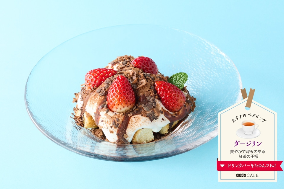 ひとくちサイズのスポンジケーキの上に、たっぷりのふわとろホイップやチョコソース、チョコフレーク&フィアンティーヌ、フレッシュないちごをトッピングした、ココス流のショートケーキ。華やかで香り高い「ダージリン」と組み合わせると、上品な気分が楽しめる。