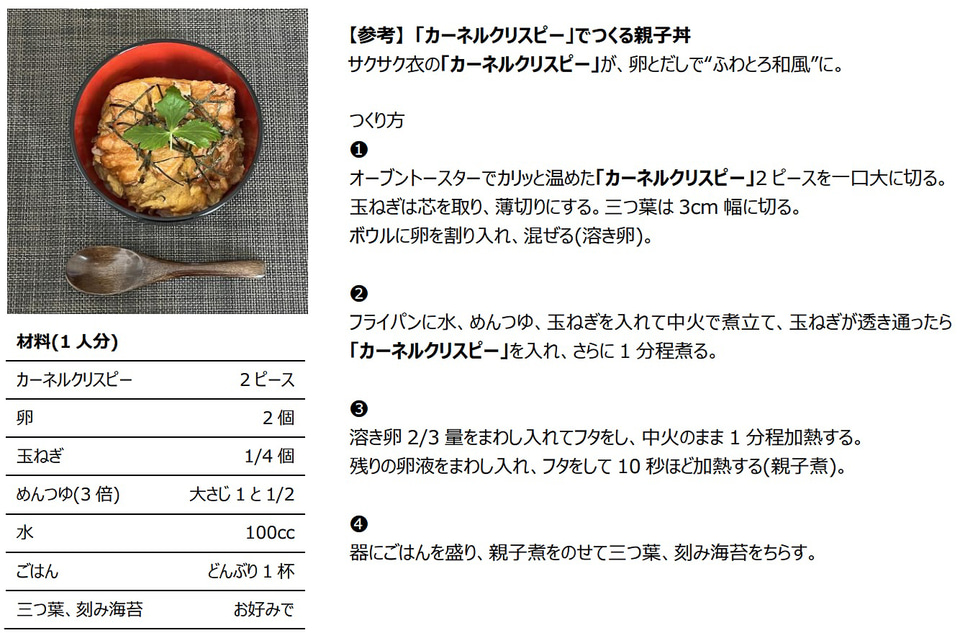 カーネルクリスピーは、天ぷらをヒントに開発された日本発祥メニューで、サクサクとした衣の食感と、にんにく醤油風味のハーモニーを楽しめる和テイストの骨なしチキン。小麦粉とでん粉の配合にこだわることで、軽やかで心地よいサクサク食感を実現したという。