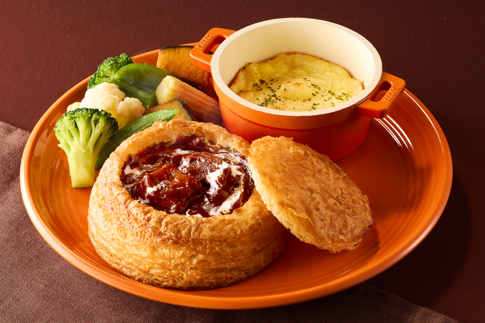 トーストしたサクサクのオリジナルデニッシュ「ココッシュ」に、濃厚ビーフシチューを合わせたシチューパイ風メニュー。チーズ入りのマッシュポテトや付け合わせの温野菜、ココッシュをビーフシチューにディップして楽しめる。
