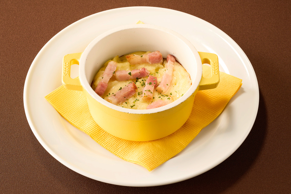 チーズを合わせたマッシュポテトにスティックベーコンをトッピングし、オーブンで焼き上げた一品。ほんのり付いたチーズのお焦げや、程よい塩味のベーコンがアクセントになっていて、お酒のお供や“もう一皿”にも。