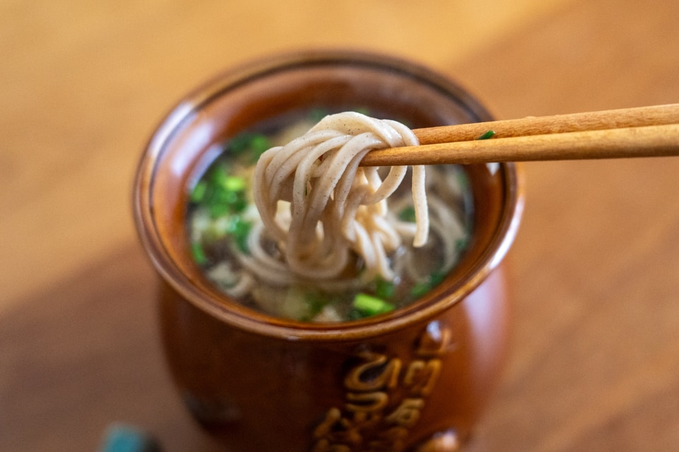 活用その1は「お蕎麦」。一般的な蕎麦どんぶりよりサイズがひと回り小さいので、全部は入り切れませんでしたが、雰囲気はよい感じ。ただ口縁があるデザインなので、おつゆは少々飲みづらいかも。