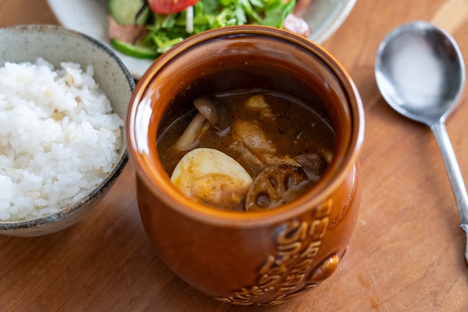活用その4は「スープカレー」! 個人的に気に入っているアレンジです。ちなみにスープカレーは、一口分のご飯をすくったスプーンを、スープカレーの中にくぐらせて食べるのが一般的とのこと。たこ壺の中に入ったカレースープもなかなかオツなものですわ~。