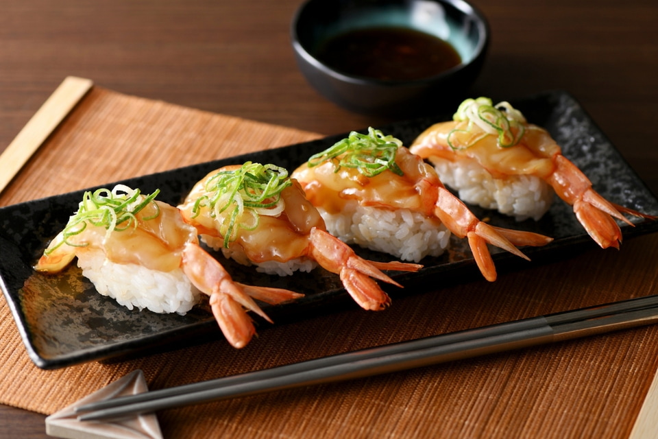 程よい甘さの醤油ダレがしみ込んだ生海老をにぎり寿司で! プリプリ、ねっとり食感が楽しめる。
