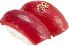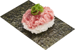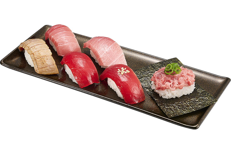 米彦が目利きをした天然本鮪を使用した商品としては、「豊洲 天然本鮪6貫盛り(大とろ、中とろ、中とろ焦がし醤油 直火炙り、赤身、煮切り醤油漬け赤身、ねぎとろ包み)」(1120円~)、「豊洲 天然本鮪ねぎとろ包み」(110円~)、「豊洲 天然本鮪赤身食べ比べ」(260円~)、「豊洲 天然本鮪中とろ」(180円~)、「豊洲 天然本鮪大とろ」(360円~)といったネタが提供される。