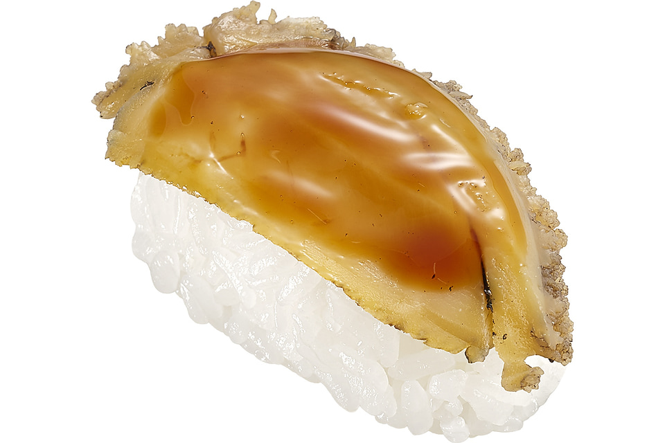 渡辺商店監修のネタでは、「煮あわび 江戸前煮詰めがけ」(360円~)が提供される。