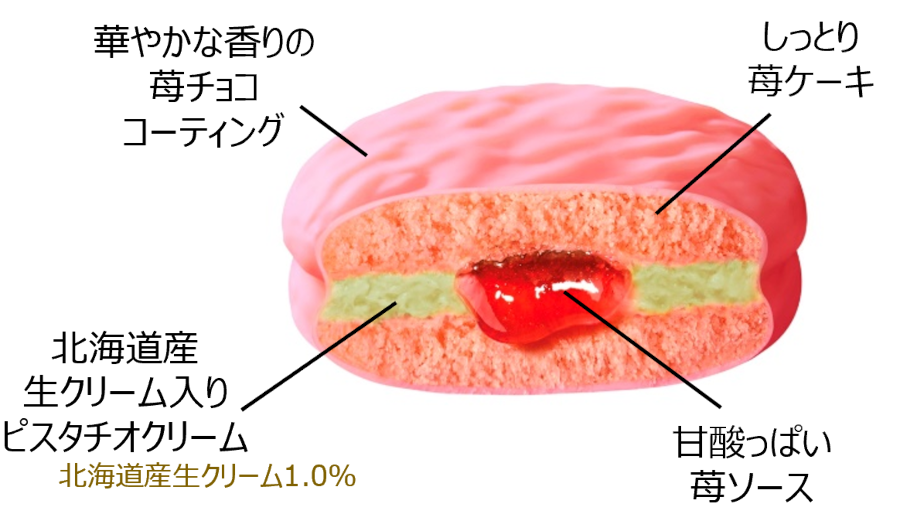ケーキのようなくちどけとご褒美感を目指して細部までこだわる「チョコパイプレミアム」シリーズでも「苺とピスタチオ」は毎年好評で今回で、4年目を迎える期間限定商品。苺の甘酸っぱさを感じられるソースや、北海道産生クリームを使った鮮やかなピスタチオクリームなどを、今年はさらにブラッシュアップ。日々のちょっとした贅沢として味わってほしいとしている。