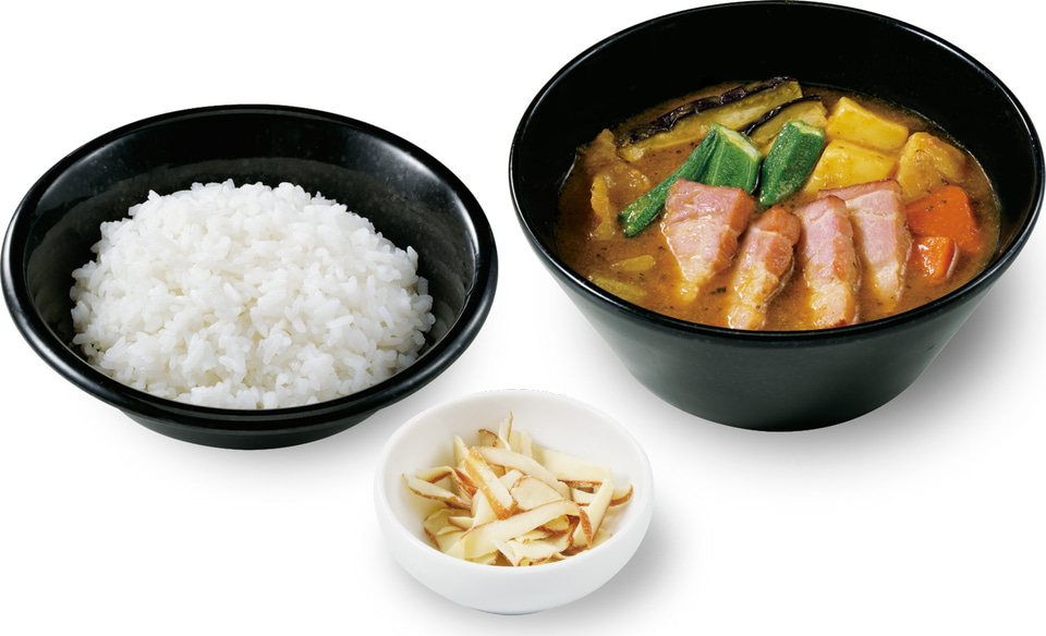 バジルの香りと香味野菜のうまみがきいたココイチ定番のスープカレーに、厚切りのベーコンをトッピングした。別皿で提供するスモークチーズを後入れすると、ふわりと香る燻製の風味とコクのあるチーズの味わいが加わり、味の変化が楽しめる。