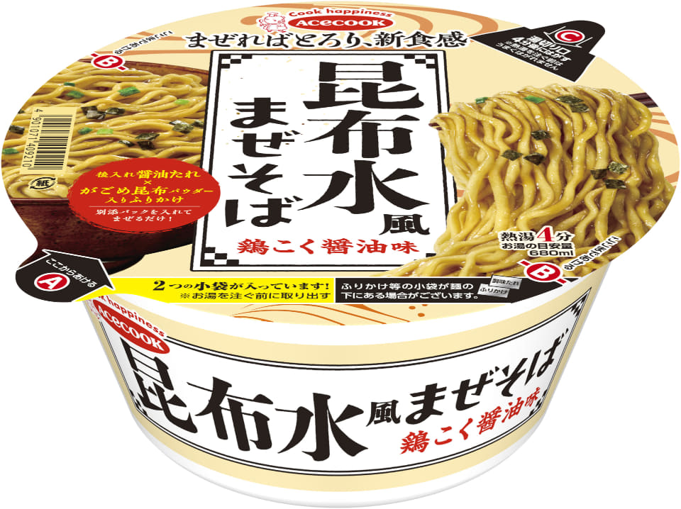 ニュースエースコック「昆布水風まぜそば 鶏こく醤油味」発売! とろりとした新食感で鶏と昆布の旨みを味わう 編集部:高嶋エリサ2026年1月30日 10:002026年2月23日 発売エースコック「昆布水風まぜそば 鶏こく醤油味」 エースコックは、「昆布水風まぜそば 鶏こく醤油味」を2月23日に発売する。内容量は127g(めん90g)で、価格は298円前後(税別)。 昆布水つけめんをイメージした汁なしのカップめんで、鶏と昆布の旨みがしっかりと感じられるように仕上げた。たっぷりの鶏だし醤油たれに、別添のがごめ昆布パウダー入りふりかけを加えることで、とろりとした新食感が楽しめる。コシのあるめんとたれがよく絡み、思わずかき込みたくなるやみつきの一杯だという。