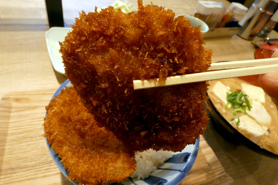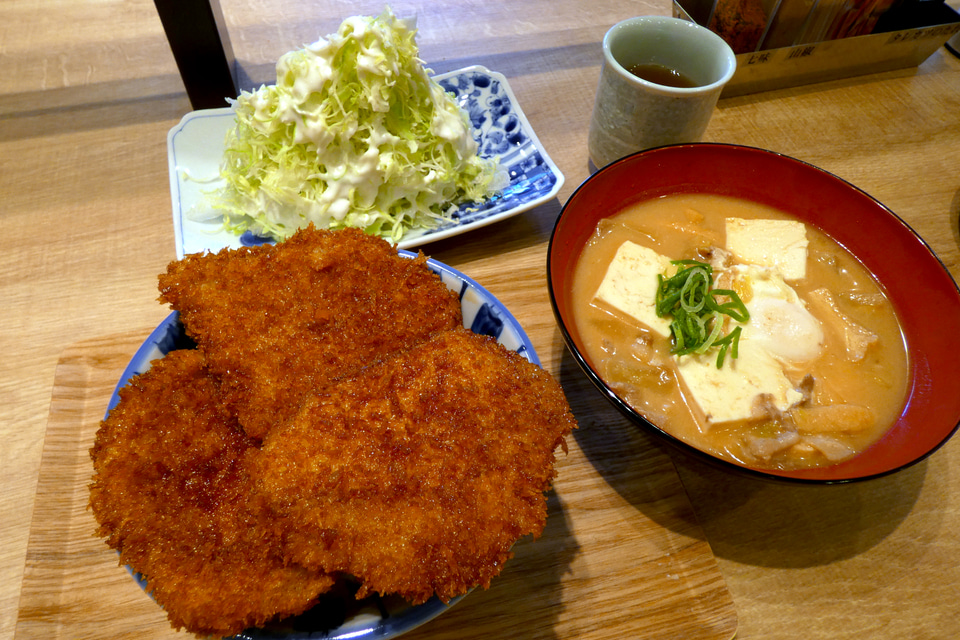 フタのように丼に覆いかぶさった3枚のタレカツは圧倒的なボリューム感で、ペース配分を間違うと、2枚もあればごはんを消費してしまい、残った1枚を持て余すことになりかねない。