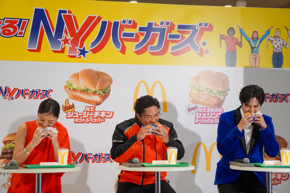 次にGENERATIONSの数原龍友さん、片寄涼太さん、タレントの池田美優(みちょぱ)さんがN.Y.を彷彿させる洗練された衣装とウォーキングで登場した。数原さんは、10代の頃にマクドナルドでアルバイトをしていたと語ると、マックデリバリースタッフの姿に着替えて2人に「N.Y. バーガーズ」をデリバリーした。