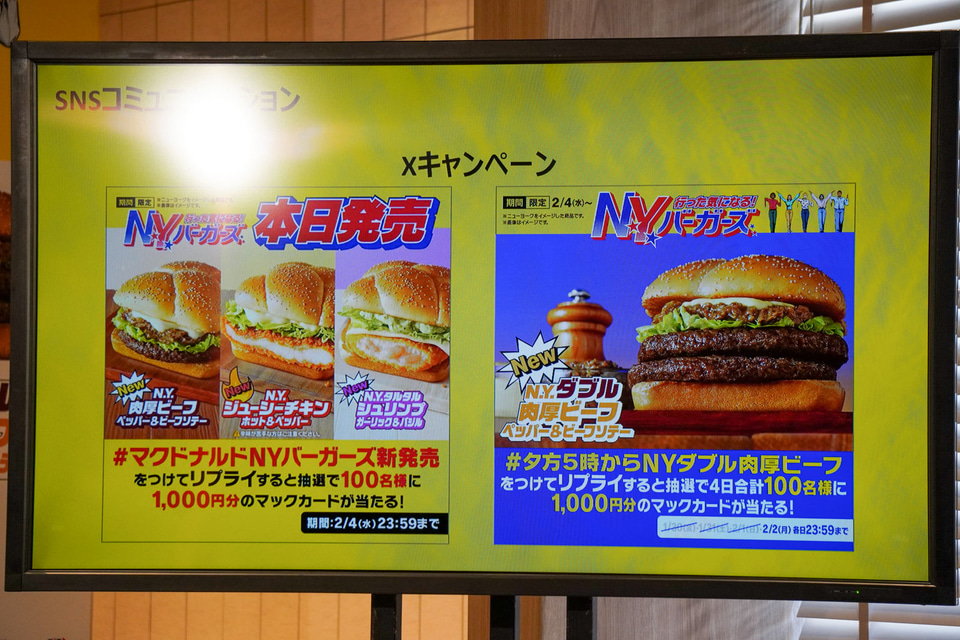 西田氏は「ニューヨークの明るく楽しい雰囲気を味わいながら楽しんでもらいたい。今回は、夜マックで肉厚ビーフパティ2枚を挟んだ『N.Y. ダブル肉厚ビーフ ペッパー&ビーフソテー』を新登場させ、朝から夜まで楽しめるようなラインアップにした」と述べた。