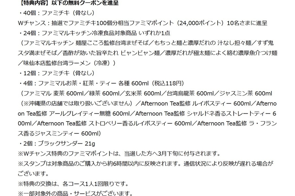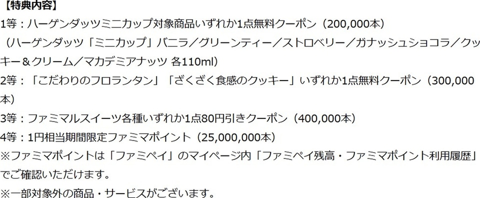 内容: 期間中に、ファミペイのバーコードをレジでスキャンし、ファミペイ払いで買い物をするたびにスタンプが1個たまる。たまったスタンプは、無料クーポンと交換、または抽選特典に応募することができる(期間中にたまるスタンプの上限は82個、1日の上限は10個まで)。