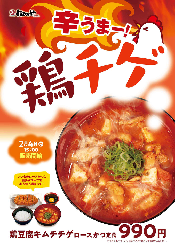 とんかつ専門店「松のや」(松屋フーズ)は「鶏豆腐キムチチゲ ロースかつ定食」を2月4日15時に発売する。価格は定食が990円、単品が530円。
