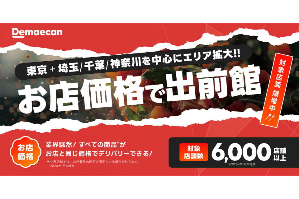 出前館は「お店価格で出前館」の対象エリアを2月1日から1都3県(東京、埼玉、千葉、神奈川)を中心に拡大すると発表した。これにより、対象店舗は6000店舗以上となる。
