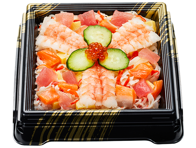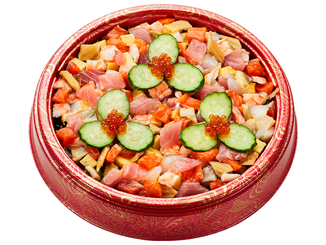 具材: いくら・まぐろ・サーモン・いか・えび・干ぴょう・玉子・きゅうり・煮穴子・海苔・ごま