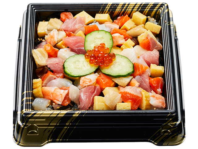 具材: いくら・まぐろ・サーモン・えび・かにカマ・玉子・きゅうり