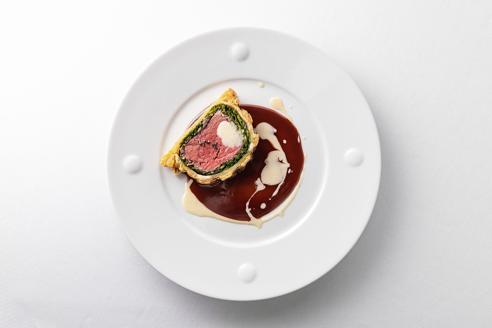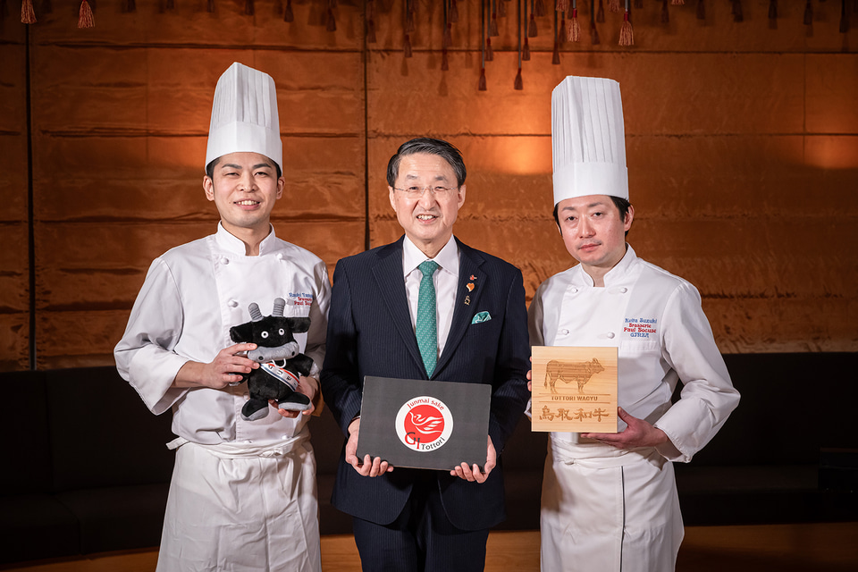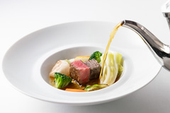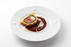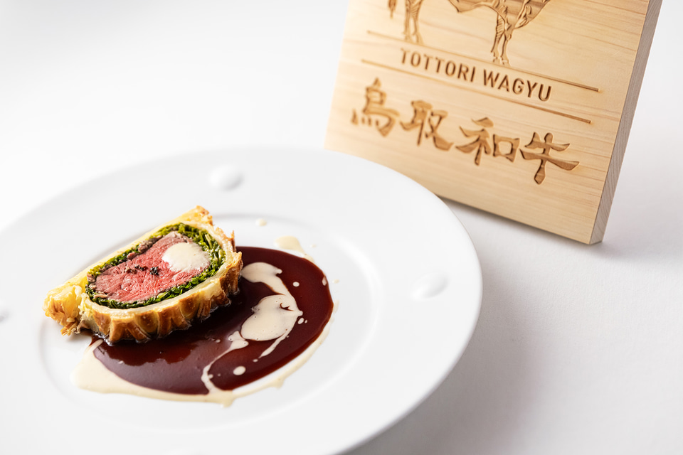 鳥取和牛は、霜降りの美しさと柔らかい肉質、さらにオレイン酸を豊富に含む脂が特徴。オレイン酸55%以上を誇る牛肉は「鳥取和牛オレイン55」としてブランド化され、年間わずか600頭のみが出荷される希少な素材として知られている。その鳥取和牛オレイン55を素材とし、パイ包み、テリーヌ、ポトフなどに仕立てて提供する。