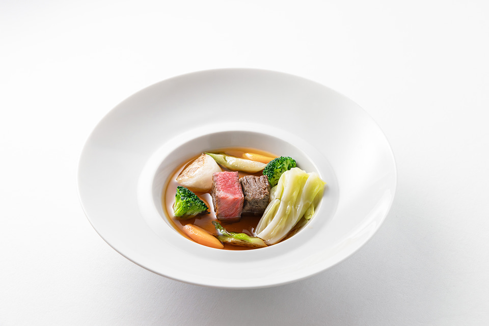 提供メニュー: 「鳥取和牛オレイン55のコンソメ 鳥取のテロワール野菜のポトフ仕立て」