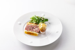 提供メニュー: 「鳥取和牛オレイン55のスネ肉、和牛頬肉とタン・田中農場の白ねぎのテリーヌ ソース・グリビッシュ」